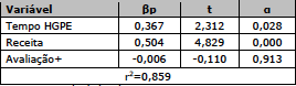 Como não pretendemos usar o modelo de regressão para predições, não tratamos aqui das estatísticas de ajustamento do modelo e preditivas. Focamos a atenção nas estatísticas descritivas, em especial nas que comparam os efeitos do dinheiro e do tempo de televisão para a eleição dos candidatos. Ainda assim é preciso testar possíveis colinearidades entre as variáveis explicativas, dado que há uma tendência de candidatos de partidos com grande parcela do horário eleitoral também apresentarem as maiores receitas de campanha. Se as duas variáveis forem colineares, o modelo de regressão não pode ser usado nem mesmo para descrever o que já aconteceu, pois os efeitos seriam majorados artificialmente no modelo. A Tabela 2 mostra os coeficientes de dois testes de colinearidade para as variáveis “tempo de HGPE”, “receita de campanha” e “avaliação” (considerando o percentual de avaliação positiva do governo em disputa) em regressão com resultado eleitoral. Para não existir colinearidade entre as variáveis, o coeficiente de tolerância deve estar acima de 0,100 e o coeficiente do fator de inflação da variância (VIF para sigla em inglês) deve estar abaixo de 10,0. Os resultados mostram que os coeficientes ficam muito distantes dos limites estatísticos, portanto, podemos seguir adiante com os modelos propostos aqui.
