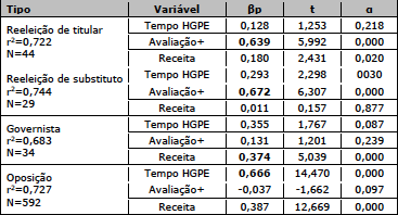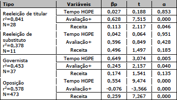 Nas disputas para prefeitos de capitais, entre os derrotados a variável mais forte é tempo de HGPE para concorrentes governistas e oposicionistas. Entre os candidatos à reeleição derrotados, os titulares do cargo apresentam alto coeficiente negativo (-0,974) com votos, ou seja, existem casos em que, mesmo bem avaliados, os prefeitos que concorrem à reeleição não conseguem ser bem votados. O coeficiente de avaliação de governo também é alto para reeleição de substituto, porém, positivo (0,923). Já entre os prefeitos eleitos, a maior explicação é a avaliação de governo, com 0,853 de coeficiente. Os recursos de campanha também são significativos, embora em coeficiente mais baixo (0,277). Entre os substitutos candidatos à reeleição, os recursos de campanha são os mais importantes (0,914). Para os governistas, a avaliação de governo apresenta relação negativa, com -0,868, o que indica que, quanto maior a avaliação positiva do governo, menor a votação do candidato governista eleito. Verdade que é o terceiro impacto em termos de peso, pois os recursos de campanha apresentam beta padronizado maior (1,407). Por fim, tempo de HGPE é a variável que apresenta maior coeficiente padronizado para as variações de votos dos oposicionistas eleitos.