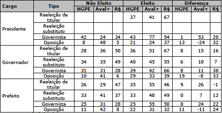 Nos casos de governador e prefeito de capital, as diferenças mais positivas são de avaliação do governo, seguido de tempo de HGPE para reeleição do titular e, no caso de prefeitos de capitais, recursos de campanha para os substitutos que disputam a reeleição. O comportamento das diferenças de médias dos candidatos governistas às prefeituras é parecido com o de governistas candidatos a presidente. Já no caso de candidatos a governador governistas, a maior diferença positiva fica em recursos de campanha. Os comportamentos das médias dos oposicionistas são similares para todos os três cargos. As diferenças positivas ficam nos recursos de campanha e no tempo de horário eleitoral, enquanto a avaliação positiva de governo sempre está abaixo de zero quando os valores são padronizados ao redor da média.