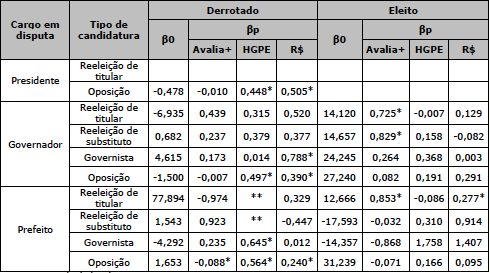 Para presidente, entre os candidatos de oposição a variável que apresenta o maior coeficiente padronizado é recursos de campanha, com 0,505. Em segundo lugar vem tempo de HGPE e, próximo a zero, porém, negativo, avaliação positiva do governo – o que reforça os resultados anteriores. Entre os candidatos derrotados aos governos de estado, o maior beta padronizado é do impacto de recursos financeiros para governistas (0,788), seguido por tempo de HGPE para concorrentes da oposição (0,497). Já entre os eleitos, a avaliação positiva de governo apresenta os maiores coeficientes e únicos estatisticamente significativos, com 0,725 para reeleição do titular e 0,829 para reeleição do substituto.