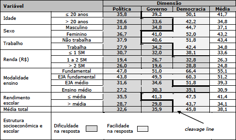 Percebe-se que algumas estruturas sociais, educacionais e econômicas facilitam as respostas sobre política, governo e democracia. Na modalidade EJA fundamental, por exemplo, representada por maiores índices de evasão e reprovação e uma distorção idade-série, o que pode indicar pior desempenho, não se cria com facilidade uma construção compreensiva das dimensões política, governo e democracia. Por outro lado, a frequência no ensino médio indica um estudo contínuo e, por causa disso, provavelmente uma melhor capacidade cognitiva em compreender essas dimensões. Entretanto, supõe-se que a modalidade não é a variável decisiva e não existe uma divisão clara ou cleavage line (Lipset e Rokkan, 1967, p. 1) entre entrevistados de certas estruturas sociais, econômicas e educacionais em dar respostas compreensíveis sobre aspectos políticos. Portanto, deduz-se que o maior envolvimento com aspectos relativos à burocracia nas três esferas de governo, expressados por itens como pagamento mensal do aluguel de habitação financiado por políticas públicas, água, luz, imposto de renda, IPTU etc., denota com mais intensidade conhecimento sobre aspectos políticos e de governo, ou a experiência vivida no sistema é mais significante em relação à compreensão sobre essas ideias, mas não necessariamente sobre o aspecto democracia.