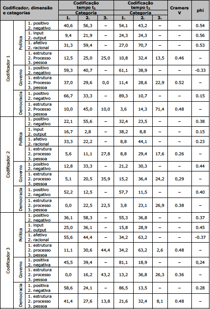 No que diz respeito a inter e intracodificação da dimensão governo, estas mostram uma maior confiabilidade nas codificações em relação à dimensão política, porém inferior em relação à dimensão democracia. Nesse caso, o codificador 1 gerou uma relação inversa (phi = -0.33) entre os intervalos, o que indica que uma percepção inicialmente preestabelecida mudou durante o processo da codificação.