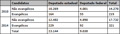 Evangélicos: O maior desafio desse tipo de análise é a identificação e a codificação dos candidatos que se declaram pertencentes à religião evangélica. Para as eleições de 2014, tivemos 17.693 candidatos concorrendo às vagas para os cargos de deputado estadual/distrital e federal no Brasil, e para a eleição anterior tivemos 14.489 candidatos para os mesmos cargos5. Como há milhares de candidatos, não é possível fazer uma avaliação caso a caso para identificar candidatos endossados ou apoiados por uma das igrejas evangélicas ou que se apresentem aos eleitores como candidatos evangélicos6.