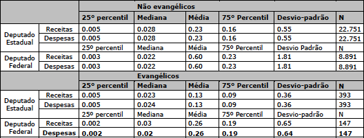 Não há diferenças discrepantes em relação ao dinheiro arrecadado e ao despendido pelos candidatos que tiveram uma campanha mais barata e localizaram-se no 25º percentil das observações para ambos os cargos. Em contrapartida, a diferença entre o grupo de candidatos evangélicos e o de não evangélicos nas campanhas mais caras (localizadas no 75º percentil) é maior. Os primeiros candidatos arrecadaram menos que os demais para ambas as disputas para deputado federal e estadual; sendo 1,2 vez mais para o grupo de candidatos não evangélicos para deputado federal e 1,7 vez mais para o mesmo grupo que concorre a deputado estadual.