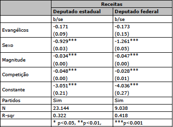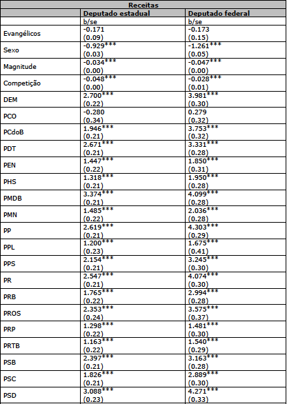 A partir do modelo estimado, podemos inferir que um candidato a deputado estadual e federal evangélico possui 0,17 ponto percentual a menos de receitas de campanha com relação aos outros candidatos. Entretanto, o resultado não é estatisticamente significante; ou seja, isso quer dizer que as receitas de campanha obtidas pelos candidatos evangélicos para cargos a deputado estadual ou federal não se diferenciam dos outros candidatos quando controlamos essa relação por sexo, magnitude do distrito, competição entre os candidatos e o partido ao qual o candidato pertence14.