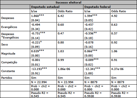onde, a variável dependente (Y) passa a ser uma dummy para os candidatos eleitos (1) e não eleitos (0). As principais variáveis independentes são: a porcentagem de despesa do candidato em relação aos candidatos para o mesmo cargo e no mesmo estado (χ1); ser candidato evangélico (χ2); e a interação entre as duas variáveis, χ1 e χ2, resultando na variável χ3. Para um maior controle do modelo estimado, temos as mesmas variáveis independentes de controle: sexo (χ4), magnitude do distrito (χ5), competição eleitoral (χ6) e partidos (χ7). Assim como no primeiro modelo, logaritmizamos a variável independente (despesas) para obter uma melhor estimação do modelo e separamos os modelos para os dois cargos em disputa.
