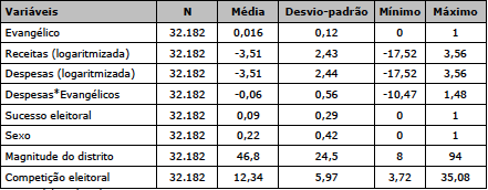 Desse modo, a variável dependente passa a ser o sucesso eleitoral dos candidatos, e as variáveis explicativas são a condição de ser evangélico, o volume de despesas durante a campanha e a interação entre as duas variáveis.