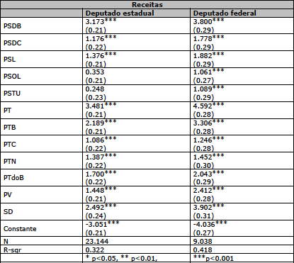 Para cada cargo de disputa eleitoral e aplicado o logaritmo natural à variável dependente, temos o seguinte modelo estimado de regressão linear: