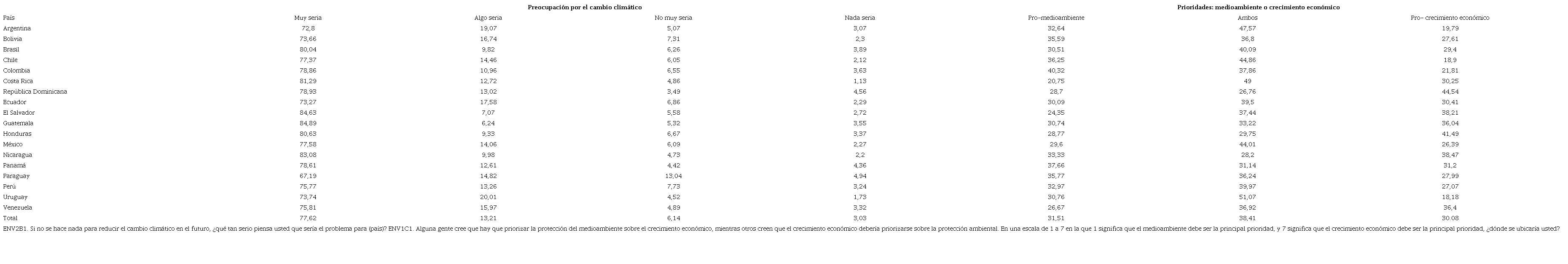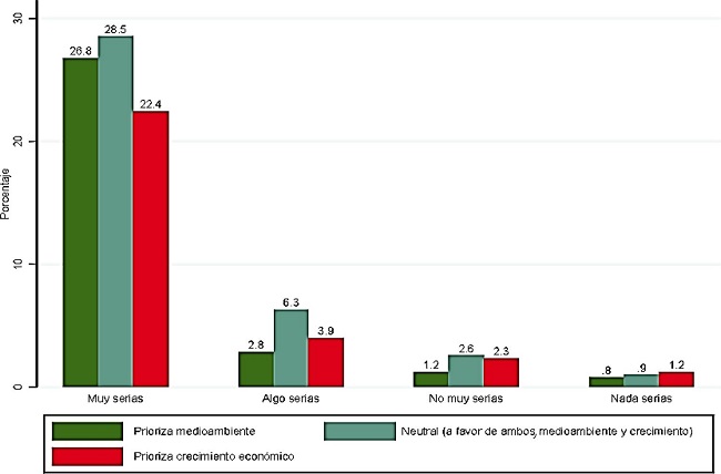 Porcentajes de respuestas a las preguntas: “ENV2B1. Si no se hace nada para reducir el cambio climático en el futuro, ¿qué tan serio piensa usted que sería el problema para (país)?” Y “ENV1C1. Alguna gente cree que hay que priorizar la protección del medioambiente sobre el crecimiento económico, mientras otros creen que el crecimiento económico debería priorizarse sobre la protección ambiental. En una escala de 1 a 7 en la que 1 significa que el medioambiente debe ser la principal prioridad, y 7 significa que el crecimiento económico debe ser la principal prioridad, ¿dónde se ubicaría usted?”. Recodifico la variable original agrupando las respuestas en tres categorías: “Prioriza medioambiente” (valores 1 y 2), “Neutral, a favor de ambos, medioambiente y crecimiento” (valores 3, 4 y 5) y “Prioriza crecimiento económico” (valores 6 y 7).