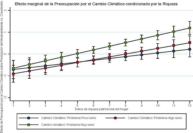 ¿En qué condiciones podemos esperar un impacto positivo de la preocupación por las consecuencias del cambio climático sobre la priorización del medioambiente? Los resultados reportados en la columna 1 sugieren que, en promedio, la alta preocupación por las consecuencias del calentamiento global (consecuencias serias) y la riqueza tienen un impacto positivo sobre la priorización del medioambiente. Dado que las hipótesis de este trabajo se refieren a efectos condicionados, los resultados centrales provienen de los modelos 2, 3 y 4, que incluyen el término de interacción entre riqueza patrimonial y los distintos niveles de preocupación por el cambio climático. Los coeficientes negativos para los distintos niveles de preocupación por el cambio climático indican que, entre los encuestados con una situación económica desfavorable, la preocupación por el cambio climático tiene siempre un efecto negativo sobre la priorización del medioambiente. Sin embargo, los coeficientes positivos y significativos para los términos de interacción entre riqueza patrimonial y las categorías para los distintos niveles de preocupación por el cambio climático sugieren que, a medida que la riqueza patrimonial crece, la preocupación por el calentamiento global se asocia positivamente a la priorización del medioambiente. Las personas ricas que consideran que las consecuencias del cambio climático serán muy serias priorizan el medioambiente más que las personas pobres con el mismo nivel de preocupación por el riesgo ambiental.