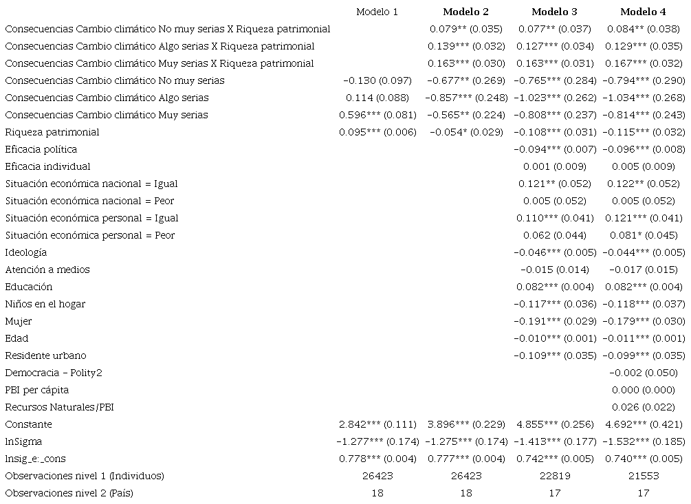 La Tabla 2 presenta los resultados de los modelos jerárquicos lineales para poner a prueba las hipótesis acerca del efecto condicionado de la preocupación por las consecuencias del cambio climático sobre la priorización del medioambiente. El Modelo 1 consiste en una especificación sin interacción y sin controles. El Modelo 2 incluye la interacción entre el indicador de la situación económica individual, el índice de riqueza patrimonial del hogar y las categorías para cada nivel de preocupación por el cambio climático con la finalidad de poner a prueba que el efecto de las creencias acerca de la gravedad del cambio climático sobre las actitudes frente al dilema entre medioambiente y crecimiento es moderado por la situación económica. Los modelos 3 y 4 incluyen los mismos términos de interacción incorporando controles a nivel individual (Modelo 3) y a nivel nacional (Modelo 4).