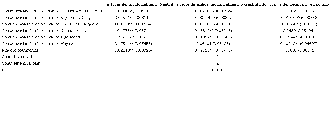 La Tabla 3 reporta los efectos marginales obtenidos de los modelos de ecuaciones estructurales para variable dependiente discreta con tres categorías, considerando la estructura anidada de los datos. Estos modelos incluyen las mismas variables y términos de interacción que los modelos jerárquicos lineales reportados en la Tabla 2 . El modelo multinomial identifica los coeficientes de cada opción de respuesta en relación con una opción de referencia. A su vez, estos coeficientes dan lugar a un conjunto equivalente de efectos marginales o impactos de las variables independientes sobre las probabilidades de elegir cada una de las tres opciones cuando se pregunta a los encuestados si prefieren priorizar el medioambiente o el crecimiento económico o ambos. Las probabilidades de priorizar el medioambiente o el crecimiento económico no son independientes entre sí. A medida que aumenta la probabilidad de que se elija una de las opciones, la probabilidad de que se elijan las otras necesariamente disminuye, ya que la pregunta de la encuesta permite elegir solo una opción. Los resultados en la primera columna – A favor del medioambiente – son casi idénticos a los reportados en la Tabla 2 . Si revisamos los valores de los coeficientes de la interacción entre riqueza y la preocupación más alta por el cambio climático, la probabilidad de priorizar el medioambiente es positiva y la de priorizar el crecimiento económico o ambos, crecimiento y ambiente, es negativa. Este efecto positivo de la riqueza sobre la relación entre la preocupación por el cambio climático y la probabilidad de priorizar el medioambiente proviene de la sustitución de la priorización del crecimiento económico y de la posición intermedia que pretende priorizar ambos, medioambiente y crecimiento, cuyos coeficientes son negativos.