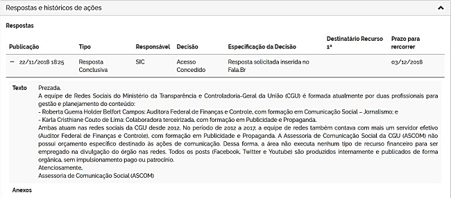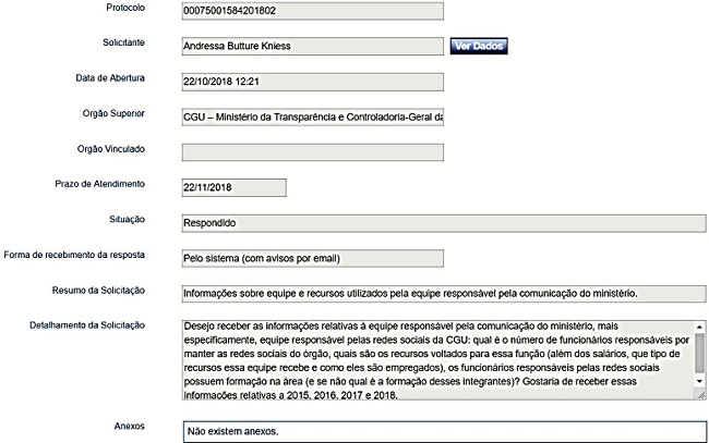 Ainda do ponto de vista dos procedimentos metodológicos, é válido sublinhar que os dados relativos a eventuais alterações na equipe responsável pela gestão das redes sociais da CGU foram coletados por meio de solicitação formal, encaminhada através da Lei de Acesso à Informação (ver Figuras 1 e 2 do Documento Suplementar).