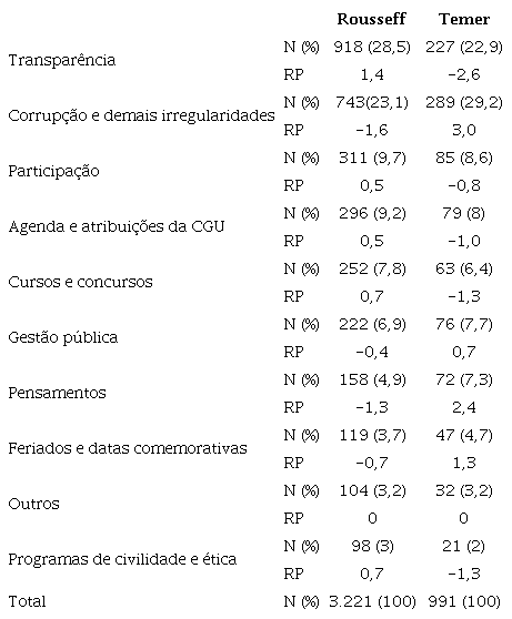 Destaca-se, primeiramente, que há uma diferença substancial no número de postagens da CGU durante os governos de Rousseff e Temer. Durante o mandato da ex-presidente eleita pelo Partido dos Trabalhadores, a CGU publicou 3.221 vezes (somando-se os posts das duas redes sociais estudadas). Já durante os meses relativos ao governo Temer, foram 991 posts. Ao longo do ano de 2015, a média de postagens por mês da CGU, no Facebook e no Twitter, foi de 231 publicações. A partir de janeiro de 2016 (portanto, ainda antes de Michel Temer assumir a presidência), a CGU diminuiu a frequência de postagens, e a média para o ano de 2016 ficou em 119. Essa redução pode ter ocorrido devido à rotatividade de ministros no intervalo aqui considerado. Quatro nomes ocuparam a direção do órgão no período: Carlos Higino substituiu Valdir Simão em 21 de dezembro de 2015, mas permaneceu no cargo apenas até fevereiro do ano seguinte. Luiz Navarro assumiu em seguida e comandou a instituição até 12 de maio de 2016. Quando Michel Temer assumiu a presidência interinamente, logo designou Fabiano Silveira para ser o ministro da nova pasta. Este foi afastado do cargo ainda em 31 de maio, sendo, então, substituído por Torquato Jardim31 .