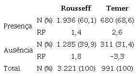 Quanto às variáveis dummy , nota-se, com base na Tabela 9 , que a presença da variável "Apelo ao envolvimento do usuário" está associada positivamente ao governo Temer (RP = 2,6), enquanto a ausência desse recurso está associada negativamente a esse governo (RP = -3,3). Isso significa que, mesmo que a CGU, durante os dois governos estudados, tenha encorajado os usuários à participação em mais da metade de suas postagens, essa estratégia foi mais utilizada na gestão de Temer.