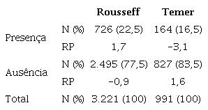 A partir de agora, o artigo se debruça sobre as associações entre as variáveis indicadas anteriormente e os governos Dilma Rousseff e Michel Temer. O Quadro 3 mostra que a única variável que não está associada aos governos é a “Presença de link ”, uma vez que o nível de significância do teste de qui-quadrado está acima do limite crítico. Isso quer dizer que tal recurso não variou conforme a mudança de chefe do Poder Executivo Federal (por isso, não haveria sentido em detalhar essa variável separadamente). Nos outros casos, há associação significativa, ainda que em níveis baixos: