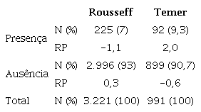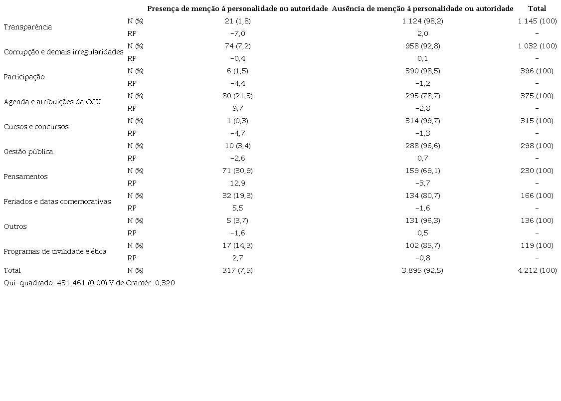 Por fim, a Tabela 11 expõe a existência de uma associação positiva entre o governo Temer e a presença de “Menção à personalidade ou autoridade” (RP = 2,0)32 . De qualquer forma, ao longo das duas gestões, as frequências comprovam que a CGU pouco se remeteu a autoridades ou pessoas conhecidas do grande público.