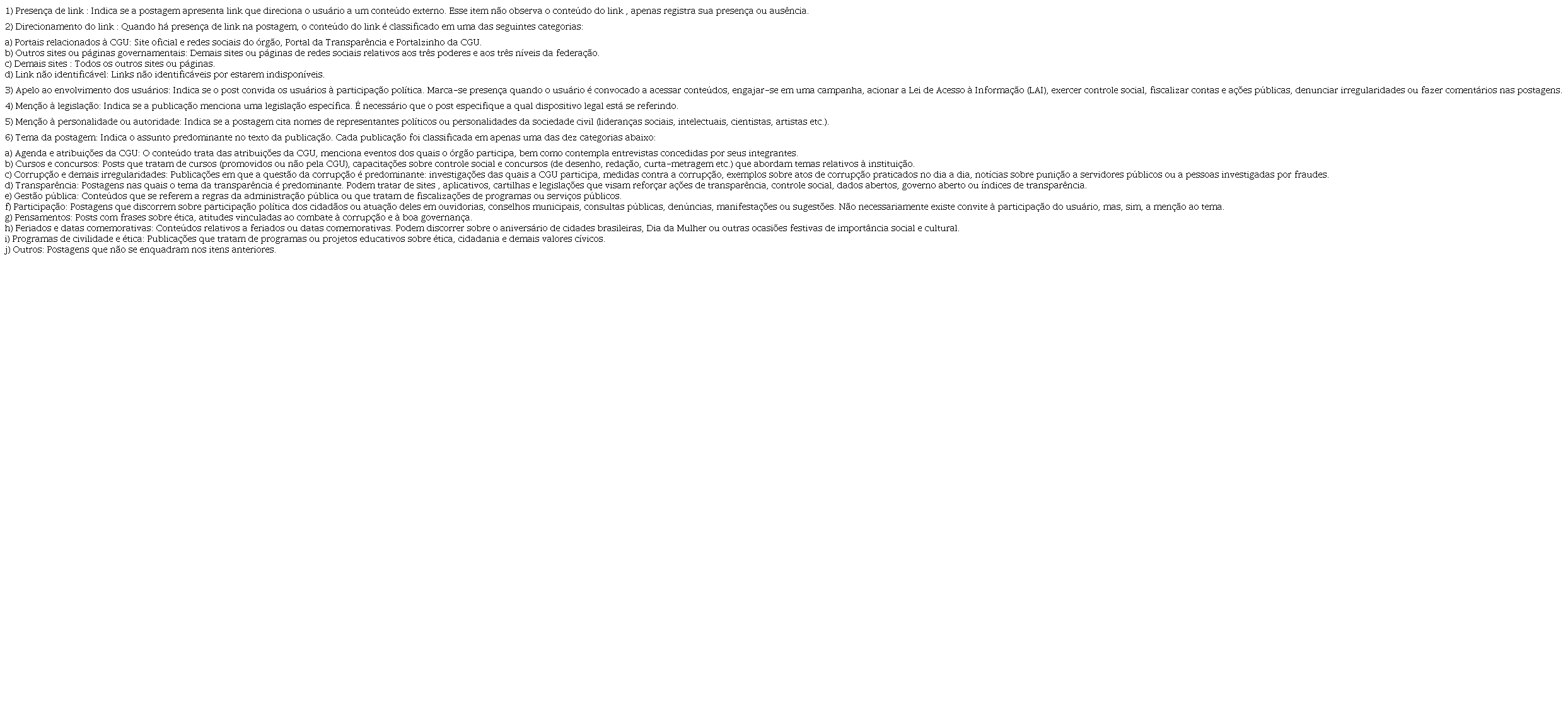 O Quadro 1 apresenta as seis variáveis categóricas que constituem o livro de códigos. Ressalta-se que quatro delas são dummy (ou seja, são binárias) e indicam presença ou ausência de determinado elemento. As outras duas variáveis – “Direcionamento do link ” e “Tema da postagem” – dividem-se em quatro e dez subcategorias, respectivamente: