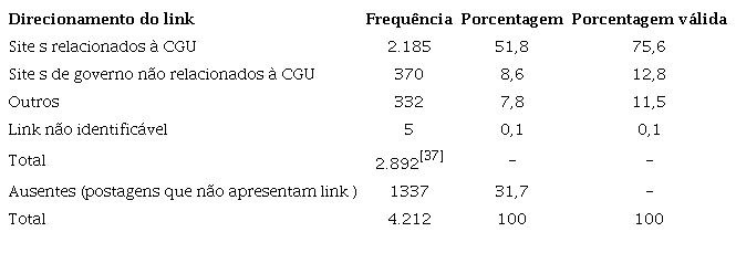 Nota-se que, em mais da metade dos posts , a CGU divulga links externos e apela para o envolvimento dos usuários. A “Presença de links ” nas publicações, assim, é a estratégia de comunicação mais utilizada pela instituição, ocorrendo em 68,3% das postagens (2.875).