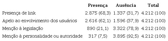 A Tabela 1 apresenta as frequências descritivas das variáveis “Presença de link ”, “Apelo ao envolvimento dos usuários”, “Menção à legislação” e “Menção à personalidade ou autoridade”: