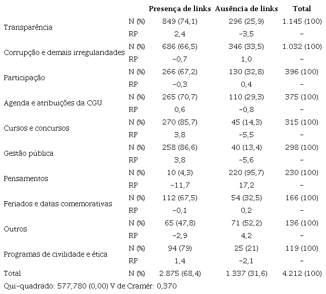 Destaca-se que, quando são realizados os cruzamentos entre a variável “Tema da postagem” e as variáveis dummy, as postagens sobre transparência tendem a mencionar legislações específicas, a oferecer links para conteúdo externo e a não mencionar personalidades conhecidas do grande público. Mais exatamente, há 15,7 casos a mais do que o esperado de postagens classificadas nesse tema que mencionam normas legais ( Tabela 3 do Documento Suplementar ); há 2,4 casos a mais do que o esperado de postagens sobre transparência que apresentam links para conteúdo externo ( Tabela 2 do Documento Suplementar ); e há 7 casos a menos do que o esperado de postagens sobre transparência que mencionam personalidades ou autoridades ( Tabela 4 do Documento Suplementar ).