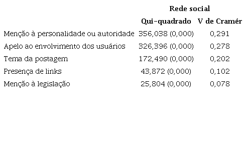 O Quadro 2 expõe, de forma decrescente, os valores do qui-quadrado e do V de Cramér a fim de verificar como as variáveis se comportam em cada rede social. Nota-se que a hipótese nula é rejeitada em todos os casos. Ou seja, há associação estatisticamente significativa entre as variáveis apresentadas. E quanto maior o valor do V de Cramér, maior é o grau de associação entre elas ( Field, 2005 ). A maior associação ocorre entre “Rede social” e “Menção à personalidade ou autoridade” (29%). Isso quer dizer que, em 29% dos casos, a variação da “Menção à personalidade ou autoridade” é explicada pela rede social. No caso das variáveis “Apelo ao envolvimento dos usuários”, “Tema da postagem”, “Presença de link ” e “Menção à legislação”, as associações ocorrem em 27%, 20%, 10% e 7% dos casos, respectivamente: