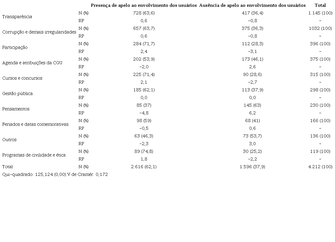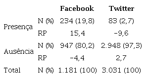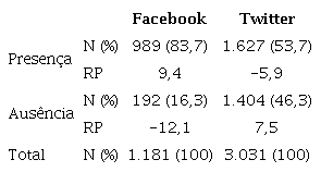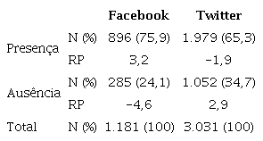 Os dados da Tabela 4 , por sua vez, apontam que, no Facebook, há 9,4 casos a mais do que o esperado de postagens que convocam o usuário à participação; e 12,1 casos a menos do que o esperado de postagens que não o fazem. O Twitter está associado negativamente à presença de “Apelo ao envolvimento do usuário” (RP = -5,9) e positivamente (RP = 7,5) à ausência desse recurso:
