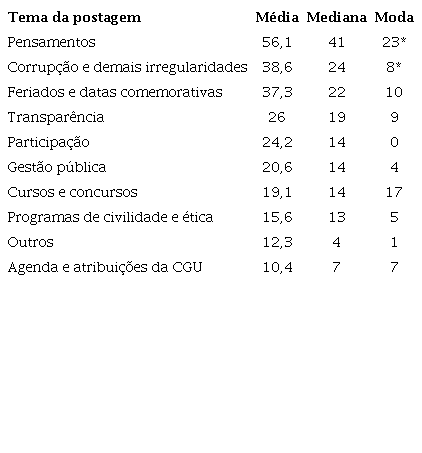 Contudo, é importante fazer duas ressalvas a esta altura. Em primeiro lugar, a transparência acessível nem sempre equivale à transparência acessada ( Schudson, 2020 ). Isto é, mesmo que as redes sociais digitais possam facilitar a comunicação entre governantes e governados, as instituições públicas não são necessariamente capazes de atingir a todos os cidadãos – e, mesmo que conseguissem, há cidadãos que permaneceriam desinteressados em consumir o conteúdo tornado disponível. No caso dos 3.031 tweets aqui analisados33 , por exemplo, a média de curtidas, respostas e retweets às postagens classificadas na categoria “Pensamentos” chega a ser mais do que o dobro da média de engajamento encontrada nas postagens sobre “Transparência” (ver Tabela 6 do Documento Suplementar ). Em outras palavras, este artigo, ainda que se debruce sobre o que a CGU trata em seus perfis de redes sociais digitais, aponta caminhos para que a entidade mapeie de forma mais eficaz o comportamento do público que a segue em redes sociais – o que permite otimizar e tornar mais eficazes as políticas de elaboração e compartilhamento de conteúdo.