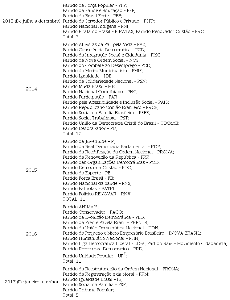 Odilla, F. “Em dois anos, partidos em formação duplicam no Brasil: 68 legendas buscam assinaturas”. BBC Brasil , 24 set. 2017. Disponível em: <http://www.bbc.com/portuguese/brasil-41266392>. Acesso em: 28 nov. 2017.