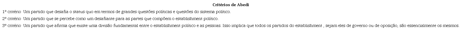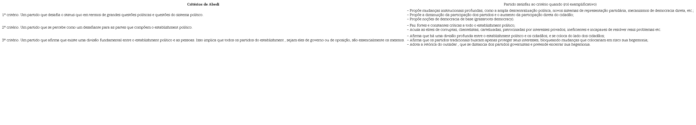 Para o autor, um partido tem retórica anti-establishment político apenas quando cumpre todos os três critérios. Dessa forma, não há possibilidade de uma visão gradualista dessa retórica (diferente do adotado com relação ao populismo por Balcere, 2014 ). Seguiremos o entendimento de Abedi (2004) neste artigo. Portanto, o programa do partido deverá satisfazer a todos os três critérios para justificar a conclusão de que tem retórica anti-establishment político.