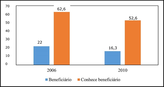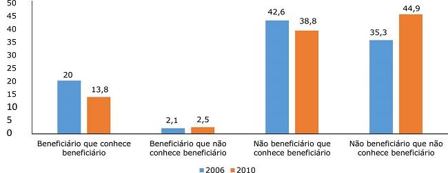 A soma entre beneficiário e não beneficiário que conhece pessoas incluídas no programa atinge a maioria dos eleitores tanto em 2006 quanto em 2010. Além disso, no primeiro ano, mais da metade dos não beneficiários do PBF conhece alguém que participa do programa social. Essa informação tem potencial importante para estimar o efeito eleitoral indireto do PBF, pois, cabe lembrar, os não beneficiários representam mais de três quartos do eleitorado. A literatura, ao focar ou interpretar apenas o impacto do programa entre os beneficiários, pode estar ignorando a dimensão do impacto do PBF.