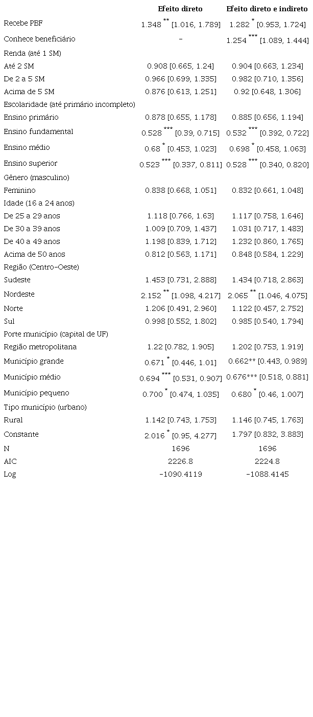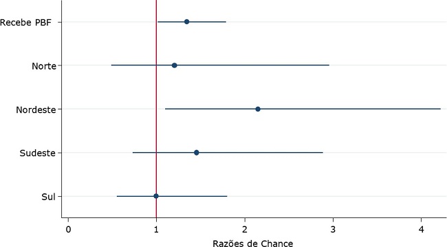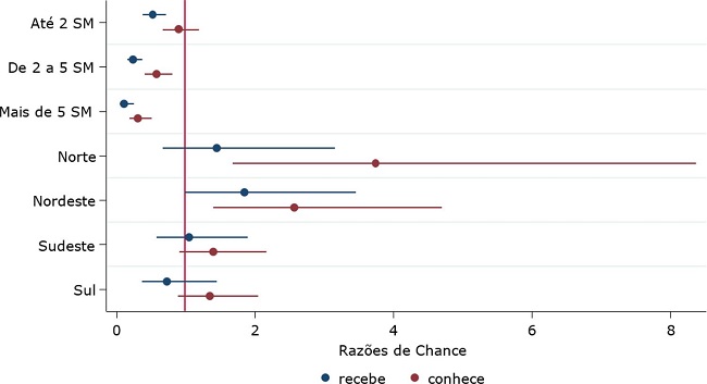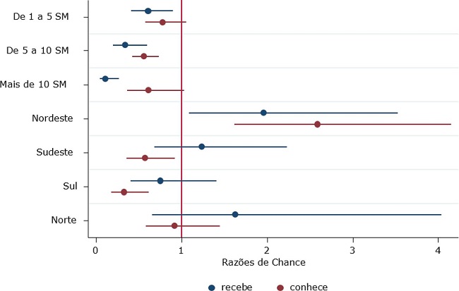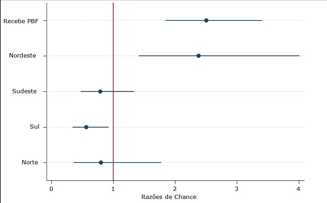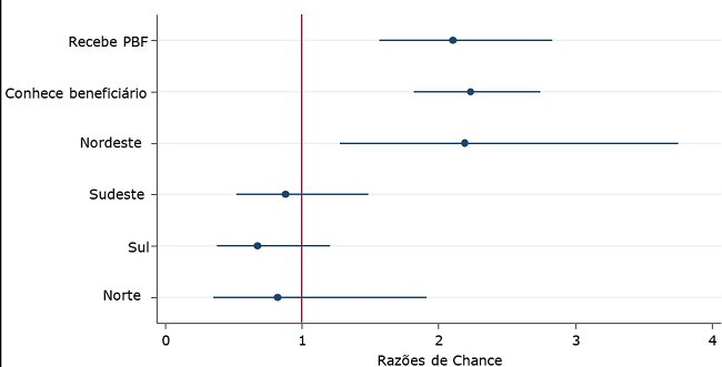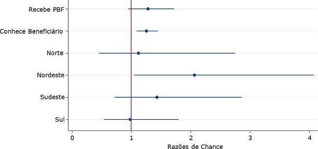 Assim como nos modelos anteriores, de modo a facilitar a visualização dos resultados no corpo do texto, privilegio apenas o intervalo de confiança de 95% das razões de chance das variáveis referentes ao PBF (receber e conhecer quem recebe) e às regiões (Sudeste, Nordeste, Sul e Norte, tendo Centro-Oeste como referência). Os resultados completos de todas as variáveis de controle encontram-se no Anexo.