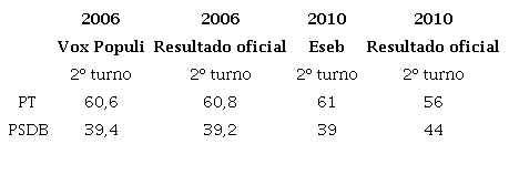 Vejamos agora esses mesmos cálculos para a pesquisa sobre a eleição presidencial de 2010: