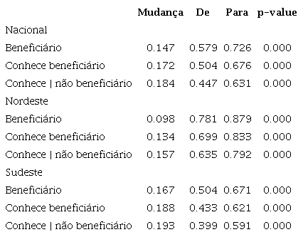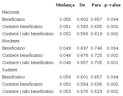 Alterações na direção da preferência do eleitor ocorrem, antes, por meio da variável que mensura conhecimento de beneficiário. Na amostra nacional, entre eleitores que não são beneficiários, o fato de conhecer indivíduo incluído no programa de transferência de renda implica alterações na probabilidade de direção de voto, cruzando o limiar de 0,5.