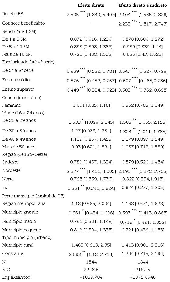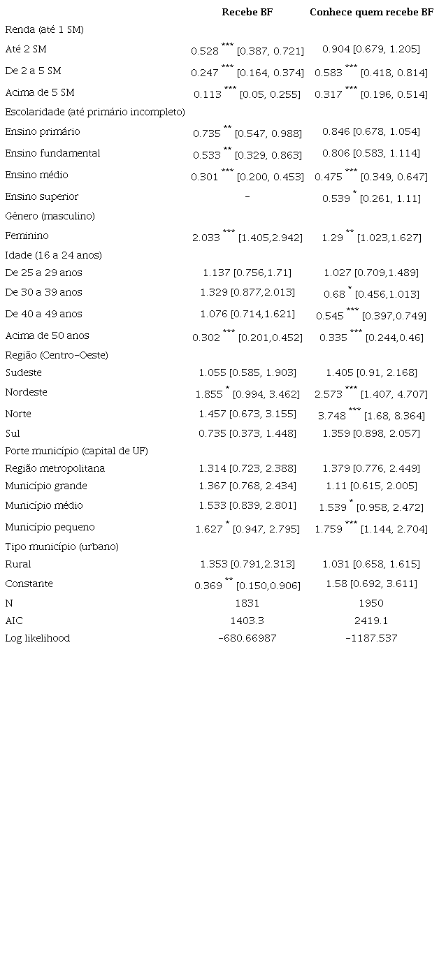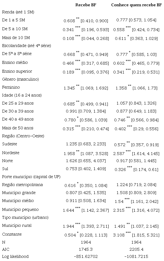 Para finalizar esta seção, apresento resultados de modelos de regressão logística multivariados sobre os determinantes de ser e de conhecer beneficiário do PBF. Utilizo variáveis independentes relacionadas às características individuais: escolaridade, renda, gênero, idade; e às localidades de moradia: região, porte do município e se este é urbano ou rural 17 . Os erros-padrão são clusterizados por unidade da federação.