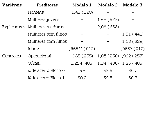 Sobre a afirmação “Considerando que você trabalhe ou trabalhasse na atividade operacional, é preferível trabalhar com policiais masculinos” ( Tabela 3 ), o Modelo 1 indica que, conforme previsto pelas teorias sobre papéis de gênero, ser homem ou mulher não faz diferença. Por outro lado, no Modelo 2 os dados são consistentes com os anteriores em relação à não comprovação das teorias sobre construção social de gênero: as mulheres jovens (36 anos ou menos) têm uma chance 18% maior do que os homens de concordar com a ideia de que é preferível trabalhar com homens nas atividades operacionais.