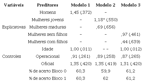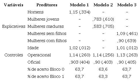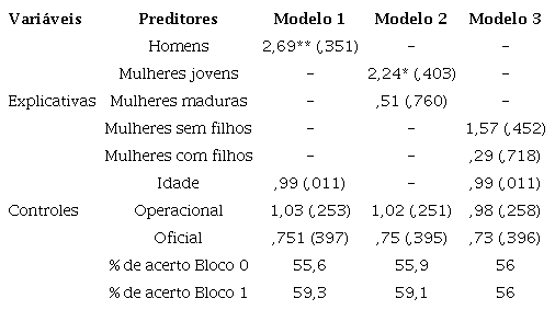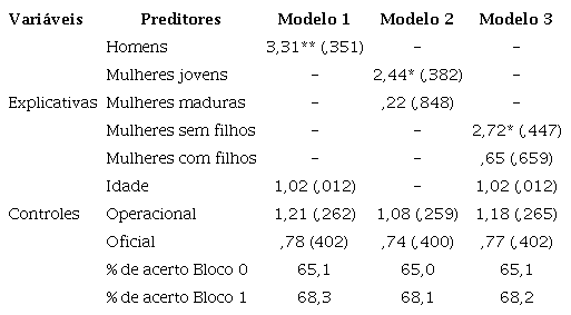 Como previsto pela perspectiva da socialização ocupacional, no Modelo 1 da Tabela 4 , ser homem aumenta em 231% a chance de concordar com a afirmação “O policial masculino lida melhor com ocorrências de risco”. Aqui os resultados também contradizem as predições das teorias sobre construção social de gênero, já que no Modelo 2 “mulheres jovens” têm uma chance 144% maior de concordância e no Modelo 3 “mulheres sem filhos” têm probabilidade de concordância elevada em 172%, sempre considerando a comparação com homens. Ou seja, o efeito é contrário ao predito pelas teorias sobre construção social de gênero.
