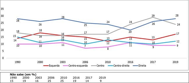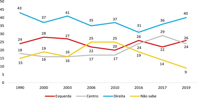 Notas : Foram desconsideradas “outras respostas”, “não respondeu” e, no survey de 1990, a categoria “nenhum/neutro/independente”. As bases efetivamente levadas em consideração são: 2.340 casos em 1990; 11.298 casos em 2000; 5.701 casos em 2003; 6.884 casos em 2006; 2.623 casos em 2010; 2.828 casos em 2016; 2.771 casos em 2017; 2.948 casos em 2019. A margem de erro é de dois pontos percentuais para mais e para menos. Usou-se um cartão de sete pontos (ver nota 20. Os entrevistados que optaram pelas posições 1 e 2 foram agrupados sob a denominação “esquerda”; o mesmo procedimento se aplicou às posições 6 e 7, chamando o agrupamento de “direita”; as demais opções ficaram individualizadas: a 3 foi denominada “centro-esquerda”, a 5, “centro-direita” e o quadro central (4), “centro”.