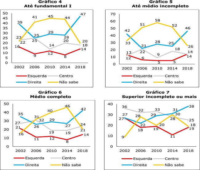 Com esse objetivo, os Gráficos de 4 a 7 apresentam a identificação ideológica entre 2002 e 2018 cruzada por escolaridade. A instrução foi escolhida para medir status tendo em vista ser, ao mesmo tempo, um clássico marcador de posição na estrutura societária e uma causa de familiaridade com a terminologia ideológica. Ressalvadas características específicas de participação política, quanto maior a escolaridade, maior a chance de compreensão dos termos esquerda e direita, e maior a tendência de manter vivas as preferências ideológicas. Ao contrário, quanto menor a escolaridade, mais baixo o entendimento das palavras que conotam ideologia e maior o afastamento da localização na escala, quando não ativada por estímulos externos.
