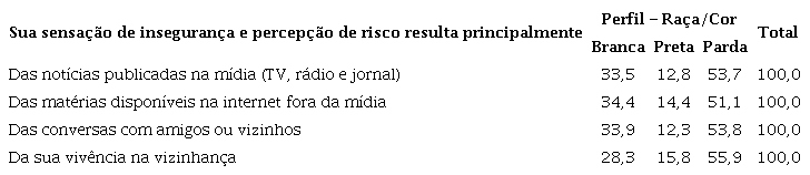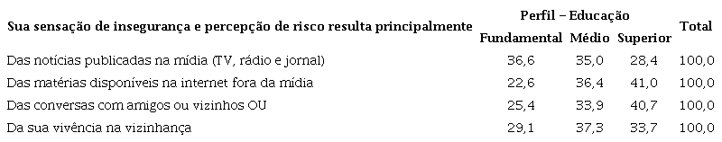 No que diz respeito à educação, a população com ensino fundamental (completo ou não) é a que mais tem a mídia tradicional como fonte de informação sobre a segurança pública. Nesse grupo, 36,6% declararam ser impactadas pela televisão, rádio e jornal. Situação oposta daquela verificada entre as pessoas com curso superior (completo ou não). Para estas, as mídias sociais, envolvendo as matérias disponíveis na internet, e as conversas com amigos e vizinhos ganham um espaço significativo na construção do medo. Por fim, cabe salientar que a vivência na vizinhança está mais presente entre as pessoas com ensino médio ( Tabela 10 ):