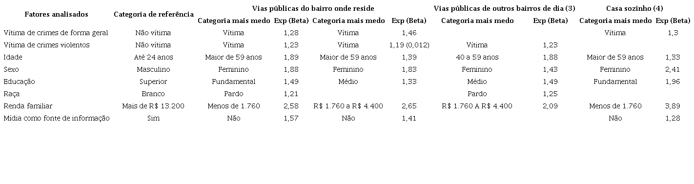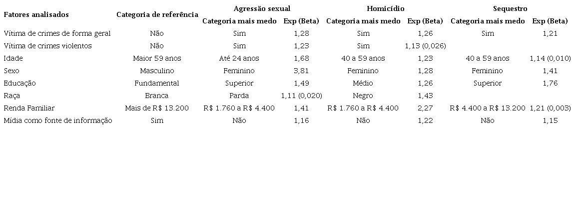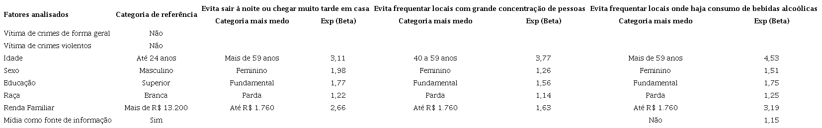 As análises dos erros padrões e níveis de significância trazidos pelas regressões logísticas nos levaram à seguinte situação: no contexto da (1) sensação de insegurança tivemos modelos estatisticamente significativos apenas para a sua explicação nas vias públicas do bairro onde a pessoa reside durante o dia e a noite, nas vias públicas dos outros bairros durante o dia e em casa sozinha. A análise da (2) percepção de risco trouxe modelos significativos para a sua explicação no contexto das agressões sexuais, homicídios e sequestros. A análise da (3) mudança de comportamento trouxe modelos de explicação apenas para evitar sair de casa à noite ou chegar muito tarde em casa, evitar frequentar lugares com grande concentração de pessoas e evitar frequentar lugares onde haja consumo de bebidas alcoólicas.