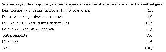 O questionário da PVD viabilizou a análise das fontes de informação que pautam a percepção da realidade da pessoa sobre a segurança pública a partir da seguinte pergunta: “Sua sensação de insegurança e percepção de risco resulta principalmente”: (1) da sua vivência na vizinhança, (2) das notícias publicadas na mídia (TV, rádio e jornal), (3) das conversas com amigos ou vizinhos, (4) das matérias disponíveis na internet fora da mídia e (5) outros.
