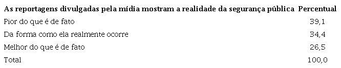 Com relação à percepção de veracidade dos conteúdos veiculados pela mídia, uma parte significativa dos entrevistados (39,1%) acredita que a mídia exagera ao noticiar crimes. Outros 34,4% acreditam que as notícias são fielmente noticiadas pela mídia. E apenas 26,5% acham que os fatos são piores do que a mídia noticiou ( Tabela 2 ):