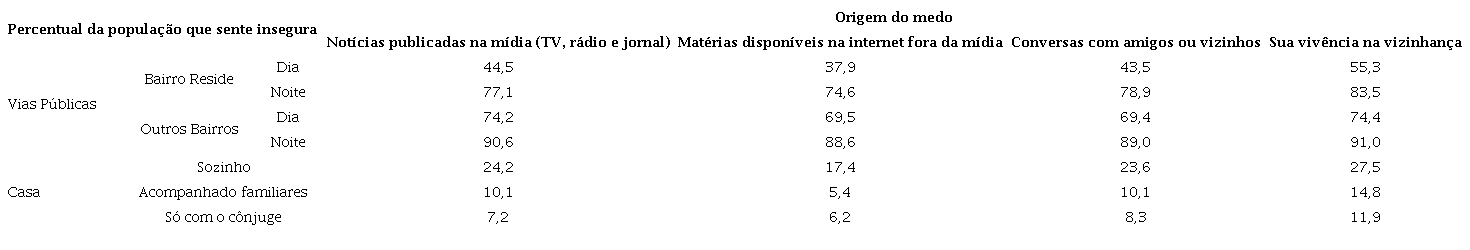 No contexto do bairro onde a pessoa mora, o maior percentual de entrevistados que se sentem inseguros está entre os que se informam sobre a situação da segurança pública pela sua vivência na vizinhança. No contexto das vias públicas dos demais bairros da cidade, os percentuais mais elevados de insegurança foram encontrados entre os que se informam tanto pela vivência na vizinhança quanto pelas notícias publicadas na mídia (TV, rádio e jornais). Por fim, cabe salientar que os menores percentuais de inseguros foram encontrados entre aqueles que se informam sobre criminalidade pela internet e especificamente no contexto da vizinhança onde a pessoa reside. A sensação de insegurança na residência onde ela mora também diminui quando a pessoa está acompanhada ( Tabela 3 ):