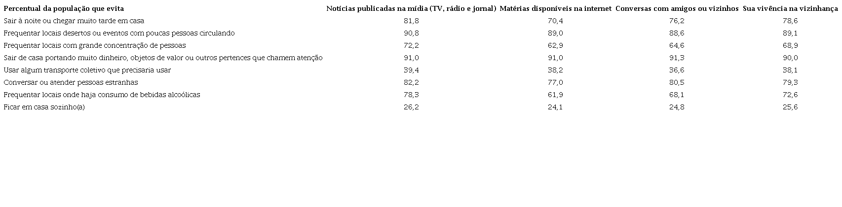No que se refere à mudança de comportamento em função da situação da segurança pública, verificamos uma semelhança, em quatro dos oito tipos de mudanças de comportamento analisadas, nos níveis de mudança de comportamento entre os informados pelos quatro tipos de fonte de informação pesquisadas. Nos outros quatro tipos de mudança de comportamento analisados (evitar sair de casa à noite ou chegar muito tarde em casa, frequentar locais com grande concentração de pessoas ou onde haja consumo de bebidas alcoólicas e conversar ou atender pessoas estranhas), encontramos os maiores percentuais de entrevistados que mudaram de comportamento entre os que se informaram prioritariamente pelas notícias publicadas na mídia. Por fim, resta salientar que encontramos os menores percentuais de entrevistados que mudaram de comportamento entre os que se informaram prioritariamente pela internet e apenas no tocante a evitar sair de casa à noite ou chegar muito tarde em casa e frequentar locais onde haja consumo de bebidas alcoólicas ( Tabela 5 ):