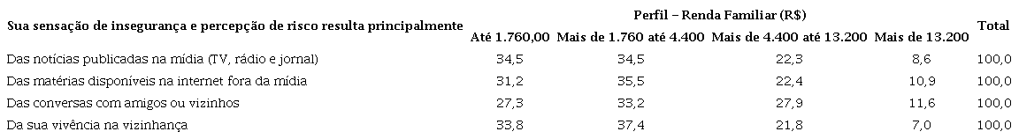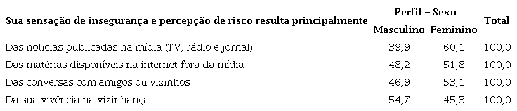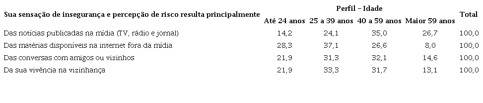 Sem desagregar os dados por variáveis sociodemográficas, essas análises da presença do medo, segundo o tipo de fonte prioritária de informação sobre a situação da segurança, evidenciam que o medo, nas dimensões da sensação de insegurança e percepção de risco, não está presente de forma mais elevada entre aqueles que têm a mídia tradicional como principal fonte de informação. Apenas no contexto de alguns tipos de mudanças de comportamento analisados encontramos elevada concentração do medo entre os que se informam por essa mídia.