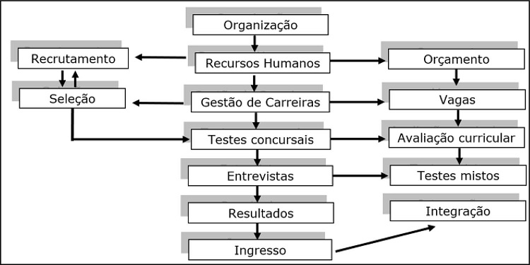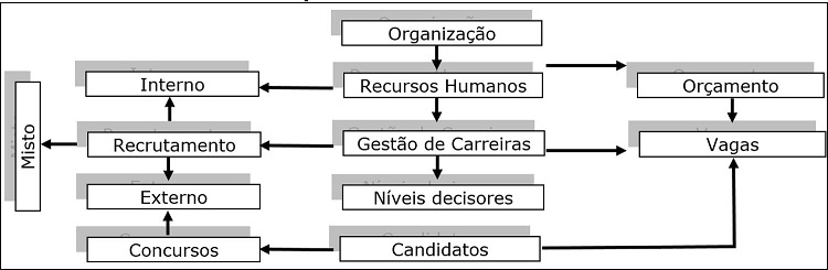A Figura 2 mostra o processo de seleção de candidatos nas organizações. Por essa via, a GRH desempenha um papel importante na organização dos procedimentos seletivos. Os candidatos têm a possibilidade de participar de vários testes para mensurar as competências gerais e específicas, cuja seleção depende do perfil que se adequa à demanda institucional. O provimento da carreira depende dos testes concursais e do orçamento que o é alocado. Por isso, a gestão de carreiras desempenha um papel crucial na intervenção dos procedimentos de recrutamento e seleção das organizações.
