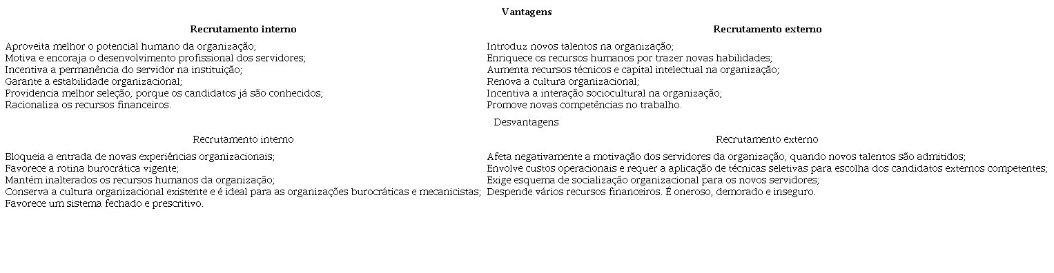 Apesar do Quadro 1 mostrar as vantagens e desvantagens dos recrutamentos interno e externo, é crucial referenciar que Setyowati (2016) considera o setor público como sendo pouco atrativo, por falta de observância rigorosa das competências dos candidatos ao provimento das carreiras, dada as disfunções na tomada de decisão para o recrutamento do quadro de pessoal.