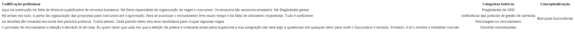 Partindo do princípio de que a entropia burocrática é um indicador que visa avaliar o grau de funcionamento de uma organização, procurando encontrar as nuances que provocam desordem na GRH, conforme mencionado na segunda seção deste artigo, os depoimentos dos participantes (n=20) mostram a ocorrência de quatro categorias teóricas que estão associadas à ocorrência das referidas entropias burocráticas do processo de recrutamento e seleção do setor público moçambicano, nomeadamente: (i) fragilidades da GRH; (ii) ineficiência das práticas de gestão de carreiras; (iii) patronagem no recrutamento e (iv) decisões centralizadas. Isso se demonstra no Quadro: