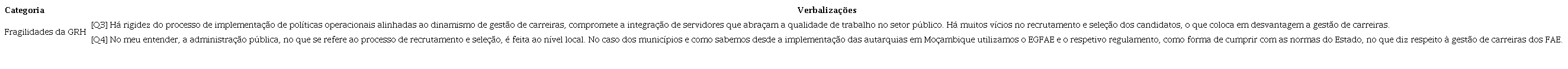 a) Fragilidades da GRH: os participantes relataram que o processo de recrutamento e seleção dos servidores públicos moçambicanos é rígido e fraco. Além disso, a operacionalização das políticas de desenvolvimento de carreiras é considerada defeituosa, pois ocorrem disfunções na sua implementação, como se ilustra no Quadro 3 :